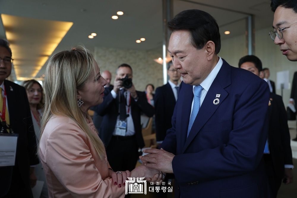 윤석열 대통령은 오늘(5. 20, 토) G7 정상회의 단체사진 촬영 후, 이탈리아 역사상 최초의 여성 총리인 조르자 멜로니 총리와 약식 환담을 가졌습니다.